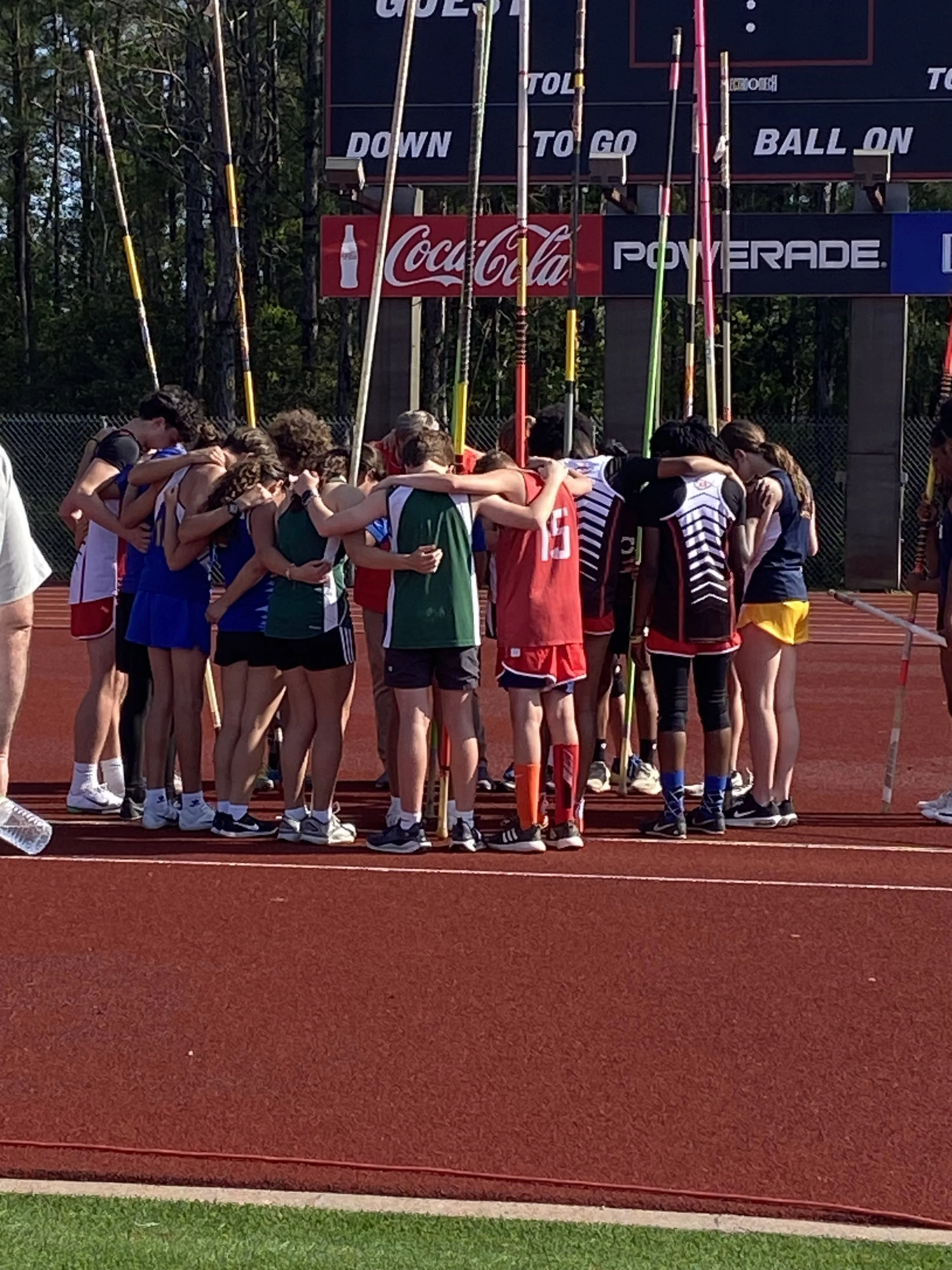 Track teams praying together before a competition.